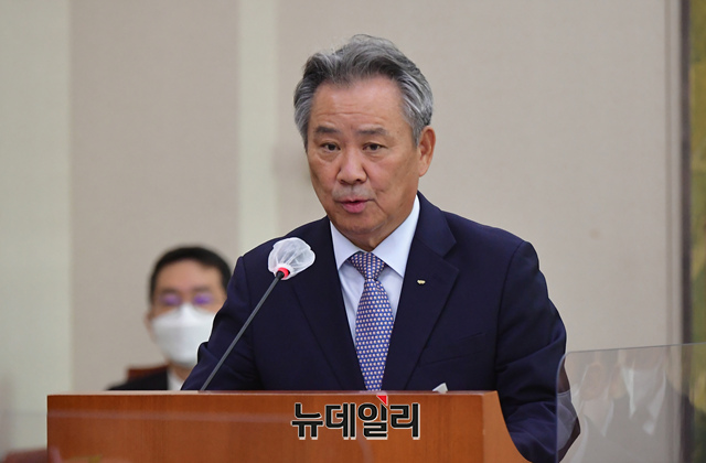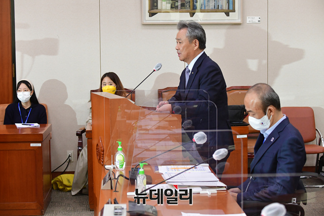 이기흥 대한체육회장이 14일 오전 국회 문화체육관광위원회에서 열린 국정감사에서 업무보고를 하고 있다.