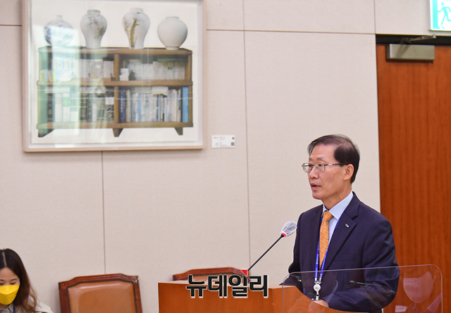 조현재 국민체육진흥공단 이사장이 14일 국회 문화체육관광위원회에서 열린 대한체육회 등에 대한 국정감사에서 인사말을 하고 있다.