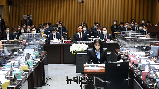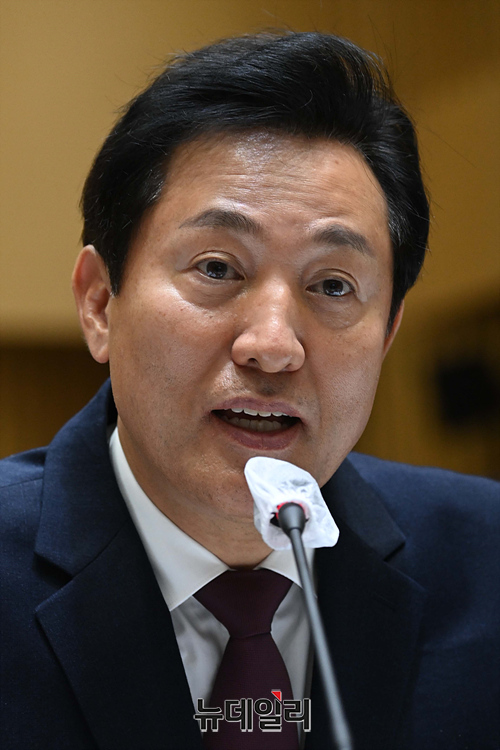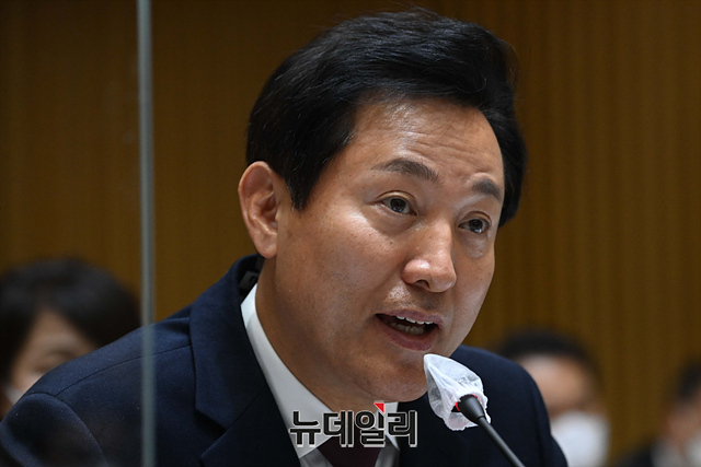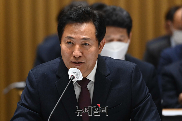 오세훈 서울시장이 14일 오후 서울시청 대회의실에서 열린 국토교통위원회의 서울시청에 대한 2022년도 국정감사에서 의원들의 질의에 답변하고 있다.