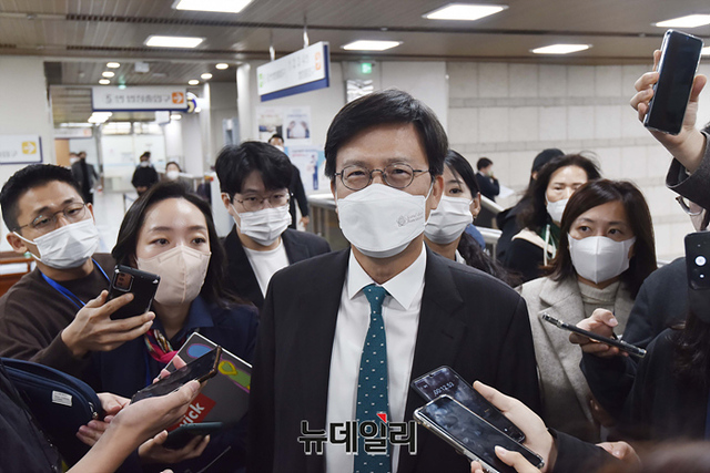 '공직선거법 위반' 혐의를 받고 있는 이재명 더불어민주당 대표 측의 변호인인 김종근 변호사가 18일 오전 서울 서초구 중앙지법에서 열린 첫 공판준비기일을 마친 직후 취재진의 질문에 답하고 있다.