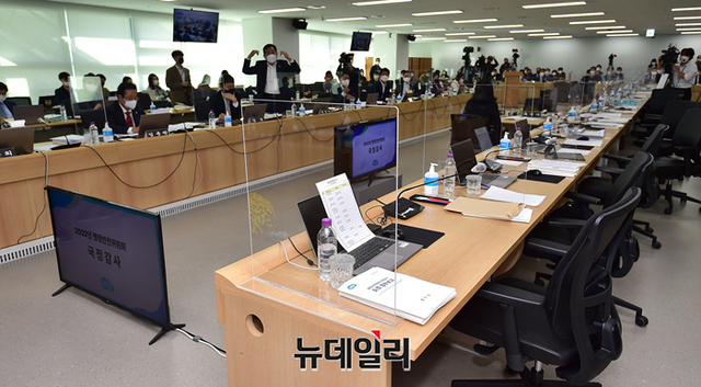 국회 행정안전위원회의 경기도 국정감사가 18일 오전 경기 수원시 경기도청에서 진행된 가운데 경기도의 자료제출 문제로 야당위원들이 퇴장해 감사가 정회되고 있다. (경기 수원=정상윤 기자)