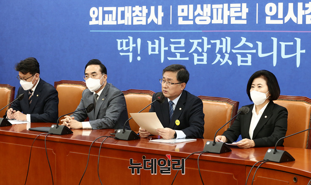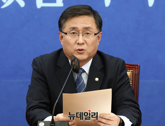 김성환 더불어민주당 정책위의장이 18일 국회에서 열린 국감대책회의에서 모두발언을 하고 있다.