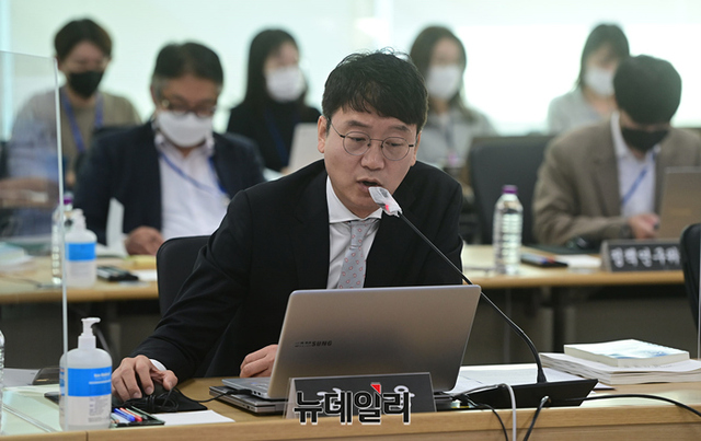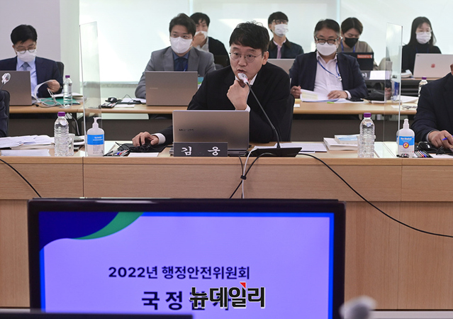 김웅 국민의힘 의원이 18일 오전 경기 수원시 경기도청에서 열린 국회 행정안전위원회의 경기도 국정감사에서 자료제출 미비를 지적하며 김동연 지사의 고발을 건의하고 있다. (경기 수원=정상윤 기자)