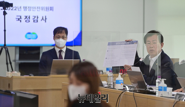 이만희 국민의힘 의원이 18일 오전 경기 수원시 경기도청에서 열린 국회 행정안전위원회의 경기도 국정감사에서 경기도의 자료제출 미비를 지적하고 있다. (경기 수원=정상윤 기자)