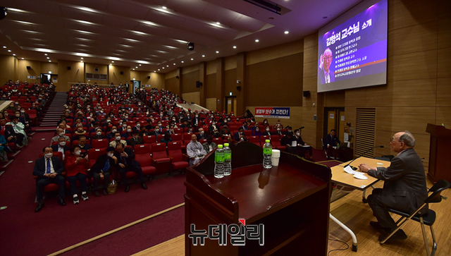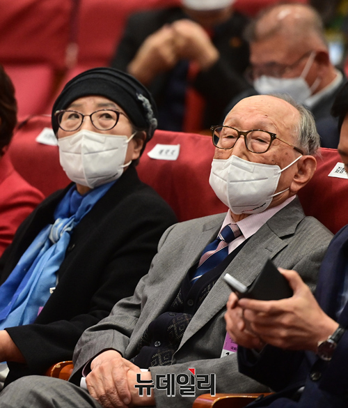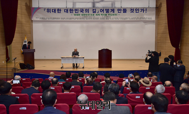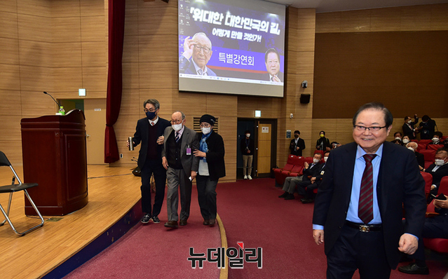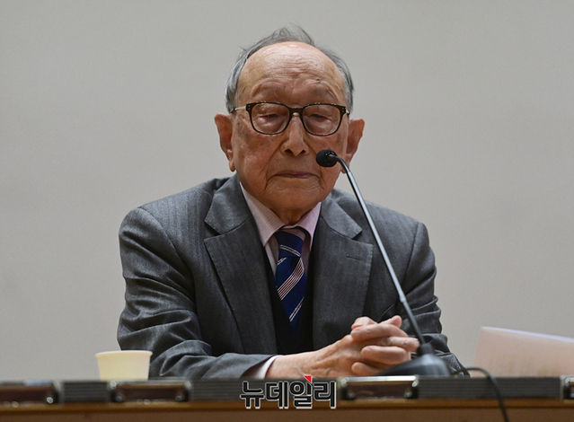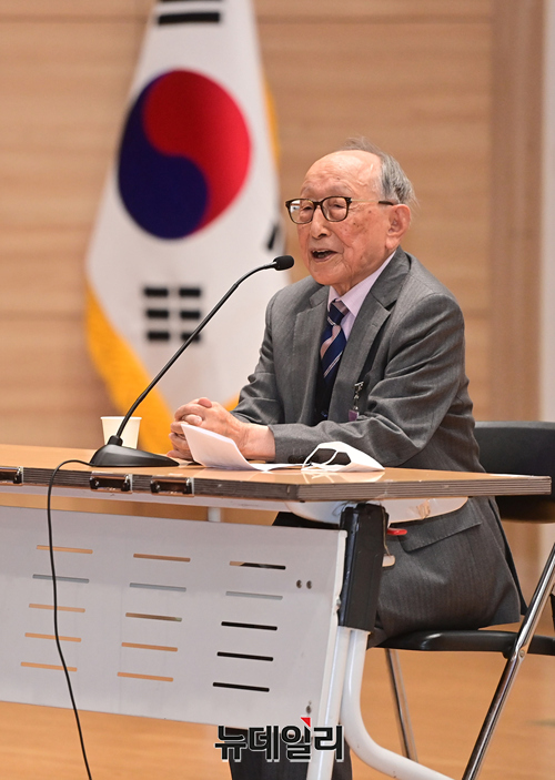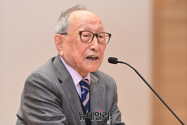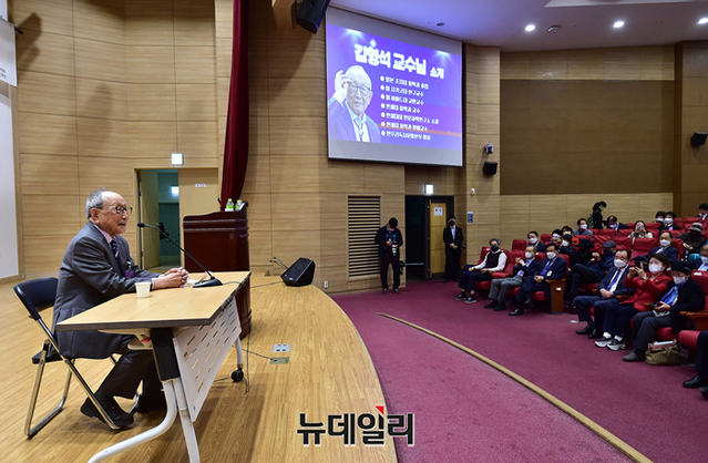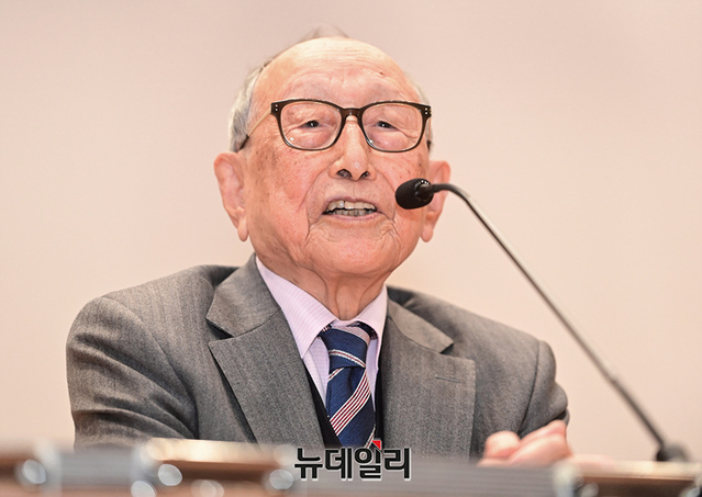 김형석 연세대 명예교수가 18일 오후 국회의원회관에서 열린 '위대한 대한민국의 길 어떻게 만들 것인가' 토론회에 참석해 강연을 하고 있다.