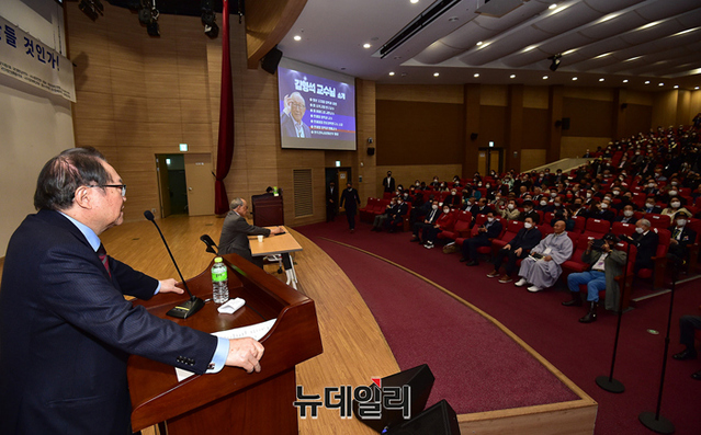 이건개 변호사가 18일 오후 국회의원회관에서 열린 '위대한 대한민국의 길'을 주제로 한 특별 강연회에서 인사말을 하고 있다. 강연회에는 김형석 연세대 명예교수와 이건개 변호사가 발표자로 나섰다.