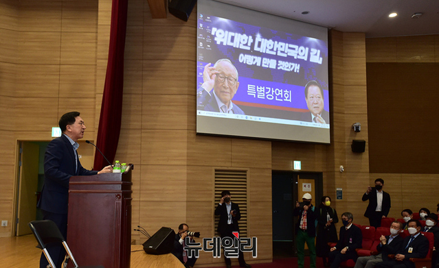 김기현 전 국민의힘 원내대표가 18일 오후 국회의원회관에서 열린 '위대한 대한민국의 길'을 주제로 한 특별 강연회에서 축사를 하고 있다. 강연회에는 김형석 연세대 명예교수와 이건개 변호사가 발표자로 나섰다.