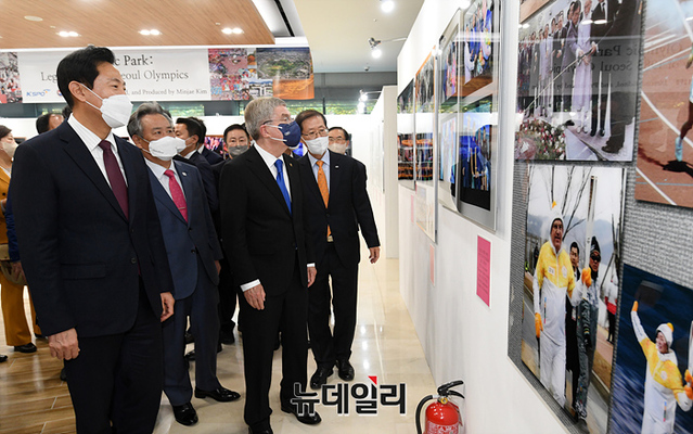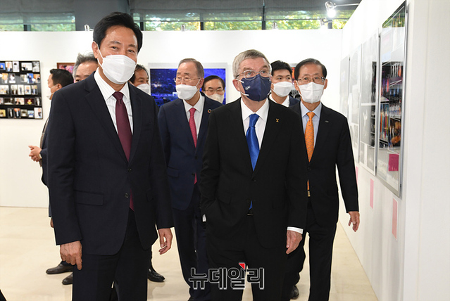오세훈 서울시장과 토마스 바흐 IOC위원장이 18일 오후 서울 송파구 올림픽파크텔에서 진행된 서울올림픽 레거시포럼 개막식에서 악수를 나누고 있다. (사진=서울시)