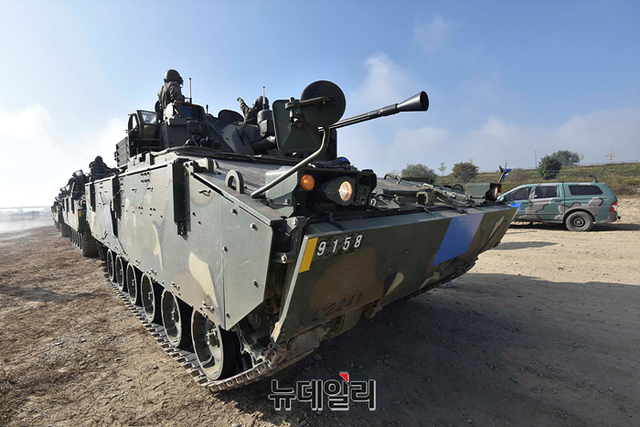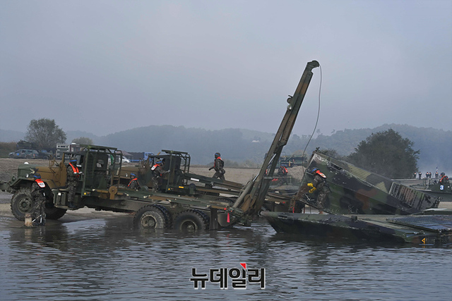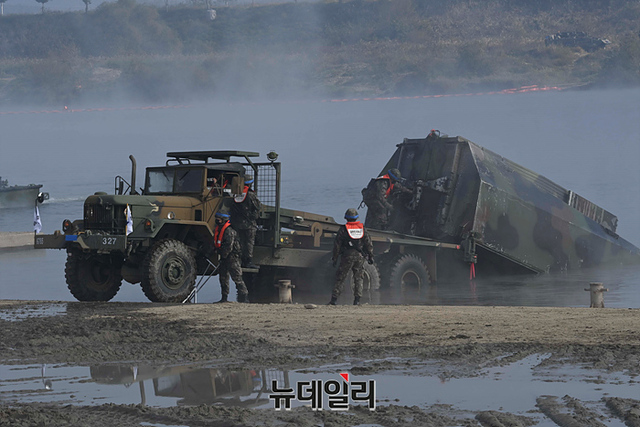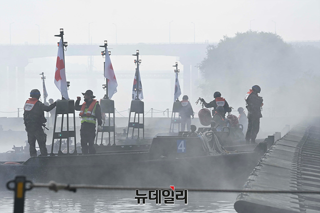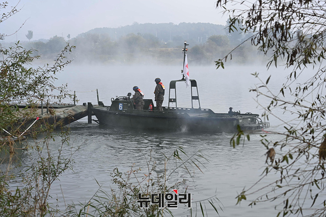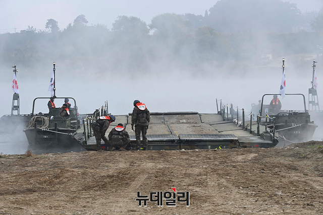 우리군이 19일 오전 경기 여주시 남한강 일대에서 열린 한·미연합 도하훈련에 앞서 문교 설치 작전훈련을 하고 있다. (경기 여주=강민석 기자)