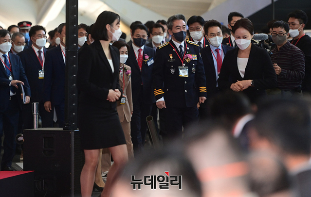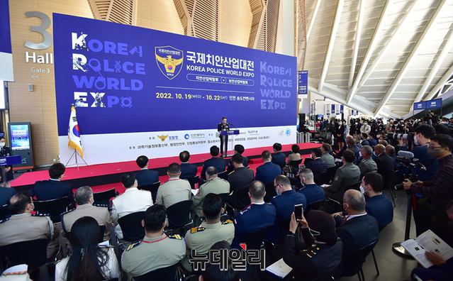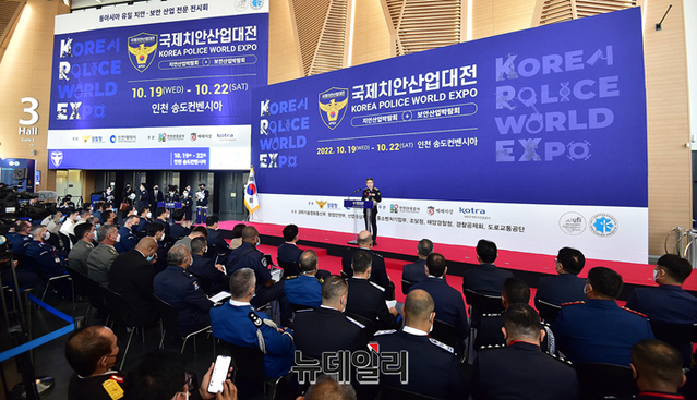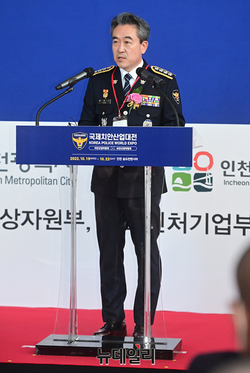 윤희근 경찰청장이 19일 오전 인천 송도컨벤시아에서 열린 '제4회 국제치안산업대전(KOREA POLICE WORLD EXPO 2022)' 개막식에서 개회사를 하고 있다.국내 유일의 치안산업 전시회인 '국제치안산업대전'은 현대자동차, KT, 대한항공, 마스터자동차, 에스앤티모티브, 다산기공, 모트렉스, 인포스테크놀로지, 로커스 등 160개 기업이 참가한다.국내 치안, 보안 산업의 최신 트렌드와 미래 지향적인 기술과 제품을 선보인다. 22일까지 4일간 송도컨벤시아에서 개최된다. (인천=정상윤 기자)