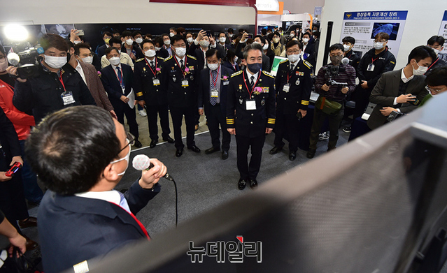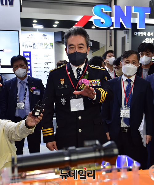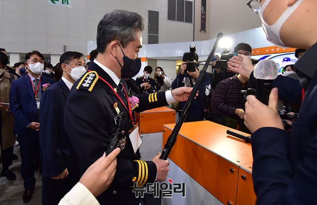윤희근 경찰청장이 19일 오전 인천 송도컨벤시아에서 열린 '제4회 국제치안산업대전(KOREA POLICE WORLD EXPO 2022)'에 참석해 치안장비를 살펴보고 있다.국내 유일의 치안산업 전시회인 '국제치안산업대전'은 현대자동차, KT, 대한항공, 마스터자동차, 에스앤티모티브, 다산기공, 모트렉스, 인포스테크놀로지, 로커스 등 160개 기업이 참가한다.국내 치안, 보안 산업의 최신 트렌드와 미래 지향적인 기술과 제품을 선보인다. 22일까지 4일간 송도컨벤시아에서 개최된다. (인천=정상윤 기자)