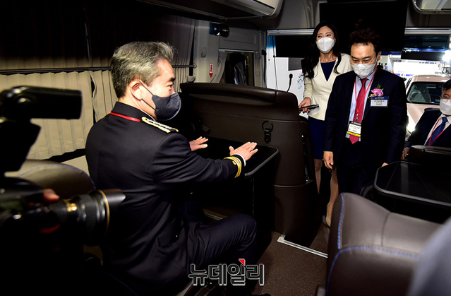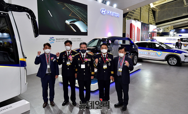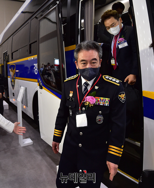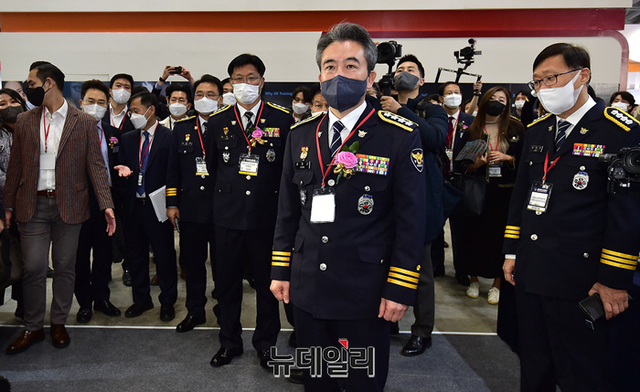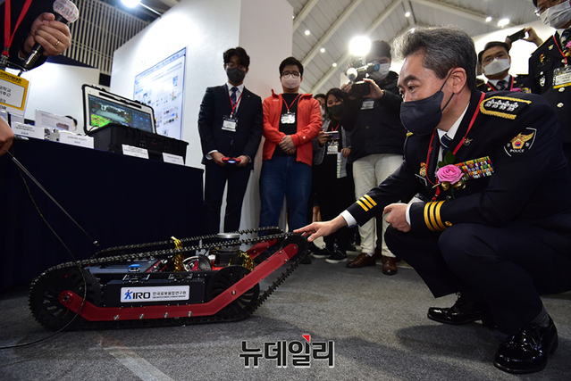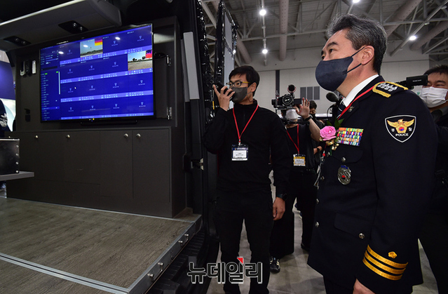 윤희근 경찰청장이 19일 오전 인천 송도컨벤시아에서 개막한 '제4회 국제치안산업대전(KOREA POLICE WORLD EXPO 2022)'에서 최첨단 보안장비를 살펴보고 있다.국내 유일의 치안산업 전시회인 '국제치안산업대전'은 현대자동차, KT, 대한항공, 마스터자동차, 에스앤티모티브, 다산기공, 모트렉스, 인포스테크놀로지, 로커스 등 160개 기업이 참가한다.국내 치안, 보안 산업의 최신 트렌드와 미래 지향적인 기술과 제품을 선보인다. 22일까지 4일간 송도컨벤시아에서 개최된다. (인천=정상윤 기자)