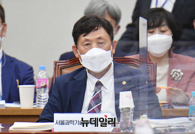 이동훈 서울과학기술대학교 총장이 19일 오전 국회에서 열린 서울대학교 등에 대한 국정감사에 출석해 질의를 듣고 있다.