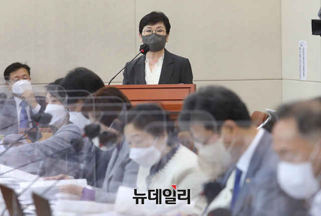 윤혜미 아동권리보장원장이 19일 국회 보건복지위원회에서 열린 한국노인인력개발원 등 7개 산하기관 국정감사에서 업무보고를 하고 있다. (공동취재사진)