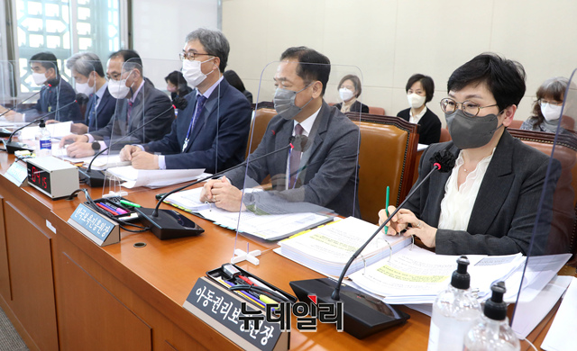 윤혜미 아동권리보장원장이 19일 국회 보건복지위원회에서 열린 한국노인인력개발원 등 7개 산하기관 국정감사에서 의원 질의에 답변하고 있다. (공동취재사진)