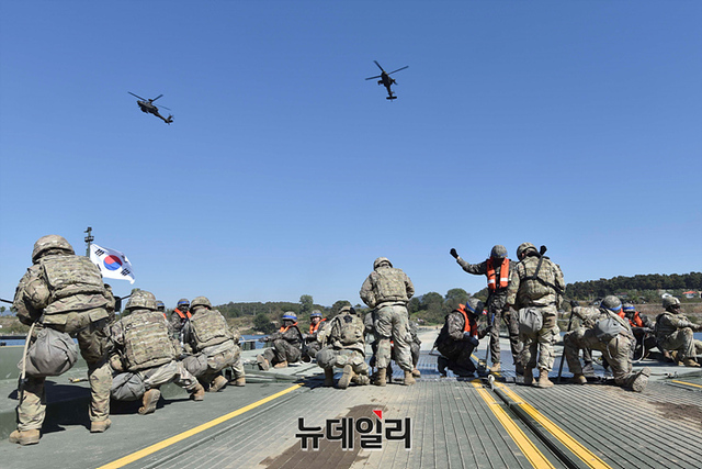 한미연합 훈련에 참가하고 있는 우리군과 미군이 19일 오전 경기 여주시 남한강 일대에서 열린 도하훈련에서 문교 설치 작전훈련을 하고 있다.