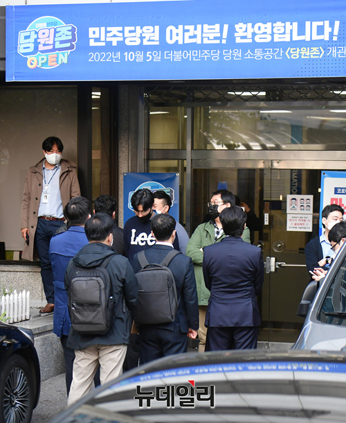 이재명 더불어민주당 대표의 최측근인 김용 민주연구원 부원장이 정치자금법 위반 혐의로 체포된 19일 서울 여의도 민주당사 건물의 민주연구원 압수수색에 나선 검찰이 민주당 당직자들과 대치하고 있다.