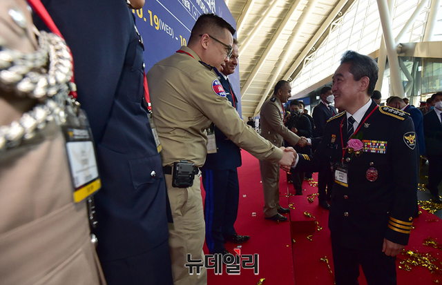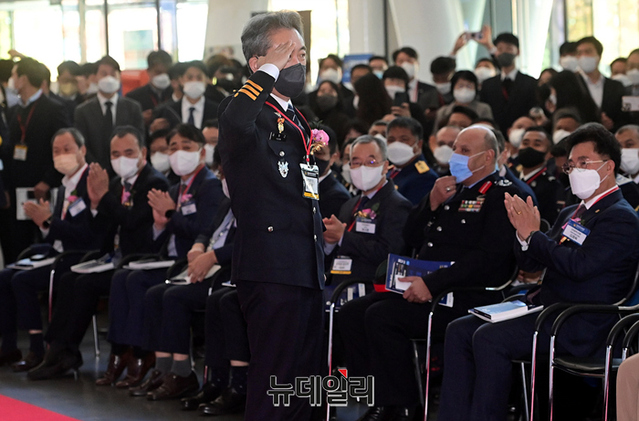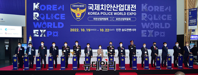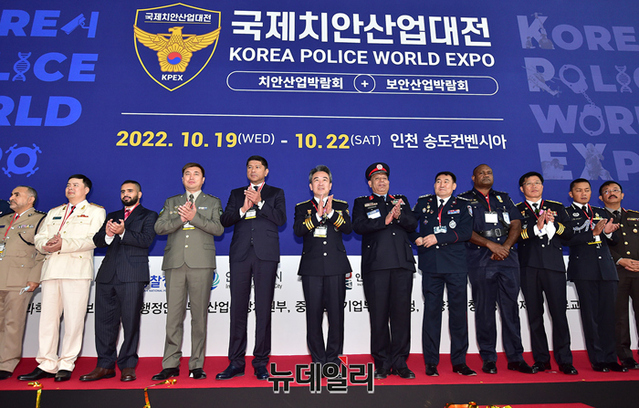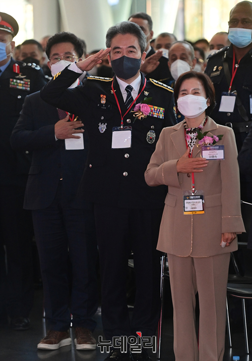 윤희근 경찰청장이 19일 오전 인천 송도컨벤시아에서 열린 '제4회 국제치안산업대전(KOREA POLICE WORLD EXPO 2022)' 개막식에서 국민의례를 하고 있다.국내 유일의 치안산업 전시회인 '국제치안산업대전'은 현대자동차, KT, 대한항공, 마스터자동차, 에스앤티모티브, 다산기공, 모트렉스, 인포스테크놀로지, 로커스 등 160개 기업이 참가한다. 국내 치안, 보안 산업의 최신 트렌드와 미래 지향적인 기술과 제품을 선보인다.22일까지 4일간 송도컨벤시아에서 개최된다. (인천=정상윤 기자)