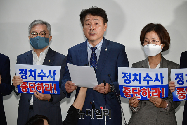 국회 법제사법위원회 기동민 더불어민주당 간사가 20일 오전 국회 법사위 전체회의실 앞에서 민주당 중앙당사 압수수색 시도 관련 규탄 기자회견을 하고 있다.