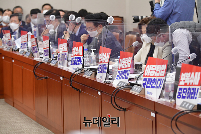 [포토] '야당탄압 규탄' 팻말 붙인 민주당 산자 위원들