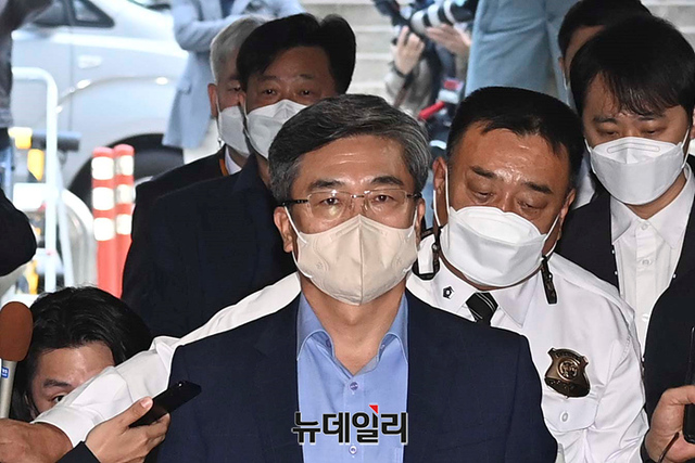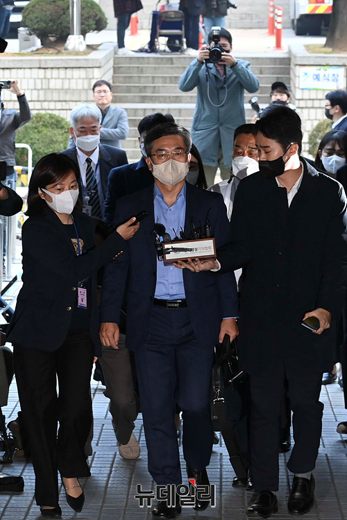 서해 공무원 피격 사건 관련 직권남용, 허위공문서작성, 공용전자기록손상 혐의를 받고 있는 서욱 전 국방부 장관이 21일 오전 서울 서초구 중앙지법에서 열린 구속 전 피의자심문(영장실질심사)에 출석하고 있다.