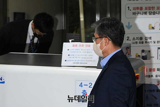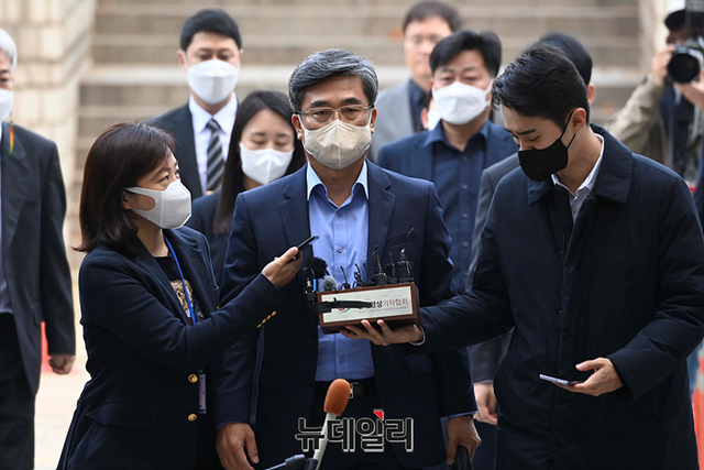 서해 공무원 피격 사건 관련 직권남용, 허위공문서작성, 공용전자기록손상 혐의를 받고 있는 서욱 전 국방부 장관이 21일 오전 서울 서초구 중앙지법에서 열린 구속 전 피의자심문(영장실질심사)에 출석하고 있다.