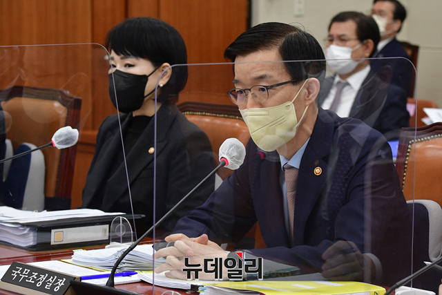 방문규 국무조정실장이 21일 오전 국회에서 열린 정무위원회 국무조정실 등에 관한 국정감사에서 의원 질의에 답변하고 있다.