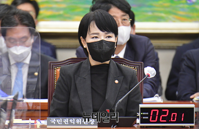 전현희 국민권익위원장이 21일 오전 국회에서 열린 정무위원회 국무조정실 등에 관한 국정감사에서 질의를 듣고 있다.