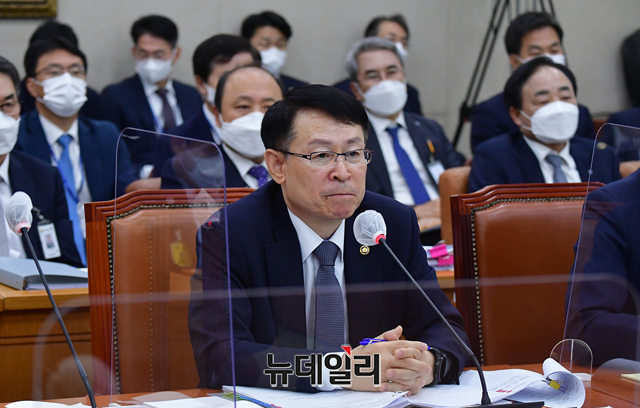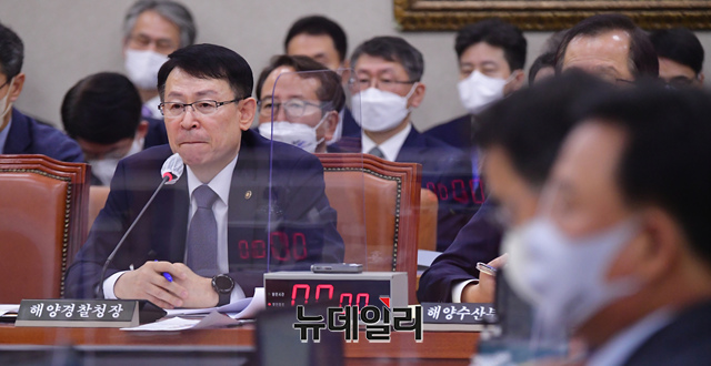 정봉훈 해양경찰청장이 21일 국회에서 열린 농림축산식품해양수산위원회의 해양수산부 및 소관 기관에 대한 종합감사에서 의원들의 질문에 답하고 있다.