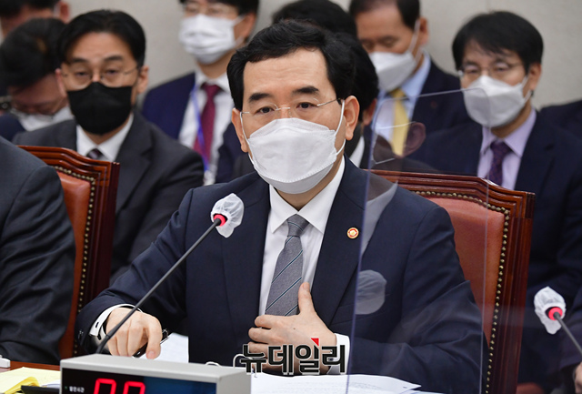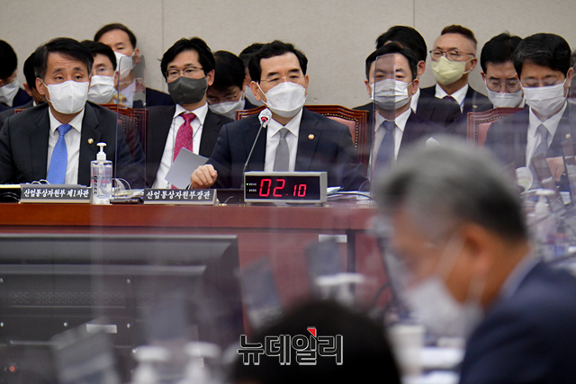 이창양 산업통상자원부 장관이 21일 국회에서 열린 산업통상자원중소벤처기업위원회의 종합감사에 출석해 의원들의 질문에 답하고 있다.