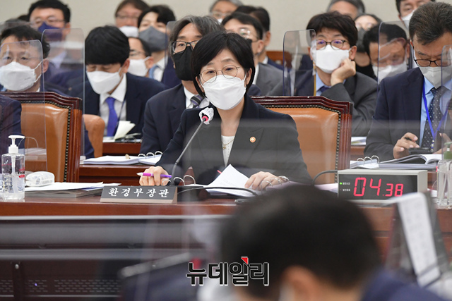 한화진 환경부 장관이 21일 국회에서 열린 환경노동위원회의 환경부, 기상청에 대한 종합감사에서 의원들의 질의에 답하고 있다.