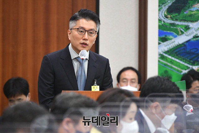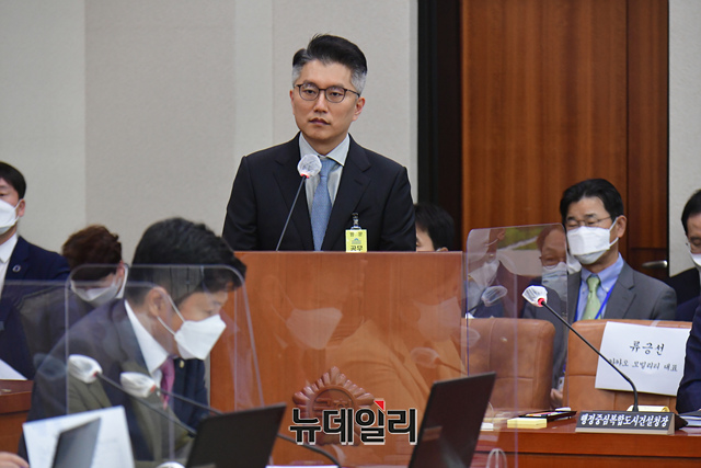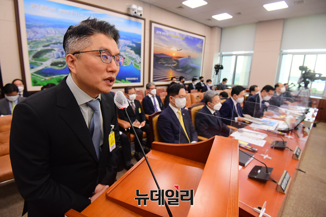 류긍선 카카오모빌리티 대표가 21일 국회에서 열린 국토교통위원회의 국토교통부 등에 대한 종합감사에서 증인으로 출석해 의원 질의에 답하고 있다.