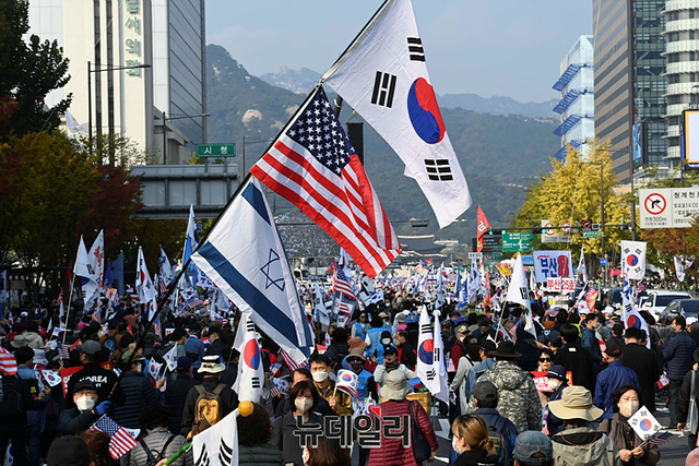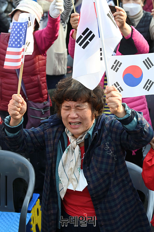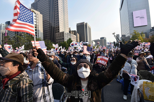 자유통일당을 비롯한 우파단체가 22일 오후 서울 종로구 동화면세점 인근에서 열린 '자유통일•주사파척결 국민대회'에서 태극기와 성조기를 흔들며 주사파 척결, 문재인 전 대통령 및 이재명 더불어민주당 대표 구속 등 구호를 외치고 있다.