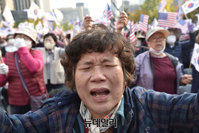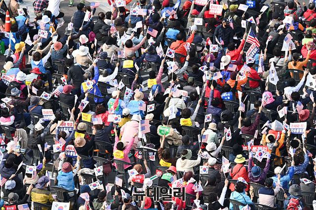 자유통일당을 비롯한 우파단체가 22일 오후 서울 종로구 동화면세점 인근에서 열린 '자유통일 주사파 척결 국민대회'에서 태극기와 성조기를 흔들며 △주사파 척결 △문재인 전 대통령 및 이재명 더불어민주당 대표 구속 등 구호를 외치고 있다.