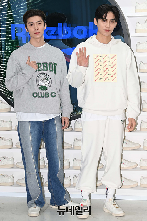 가수 유태양(오른쪽), 휘영이 22일 오후 서울 성동구 퓨처 소사이어티에서 열린 '리복 런칭 파티 셀럽'에서 열린 행사에서 포즈를 취하고 있다.
