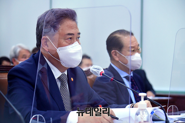 박진 외교부 장관이 24일 국회에서 열린 외교통일위원회의 외교부, 통일부 민주평화통일자문회의사무처 등에 대한 종합 국정감사에서 의원들의 질문에 답하고 있다.