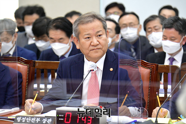 이상민 행정안전부 장관이 24일 국회에서 열린 행정안전위원회의 행정안전부, 중앙선거관리위원회, 인사혁신처, 경찰청, 소방청 등에 대한 종합감사에서 의원들의 질문에 답하고 있다.