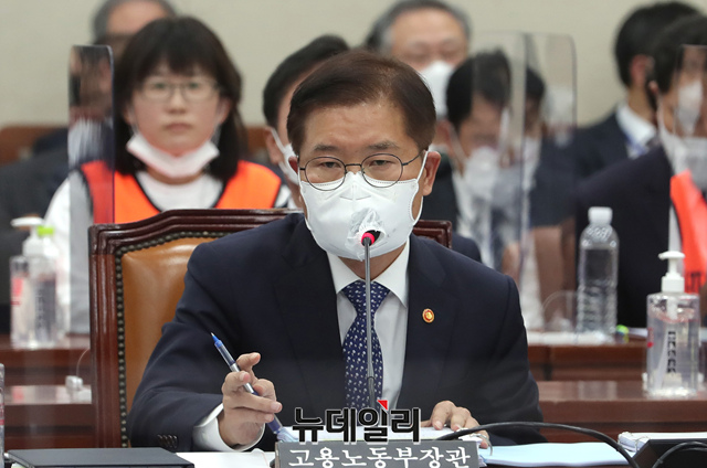 이정식 고용노동부 장관이 24일 국회에서 열린 환경노동위원회의 고용노동부, 경제사회노동위원회에 대한 국정감사에서 의원들의 질문에 답하고 있다.