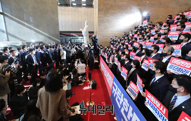 윤석열 대통령이 25일 2023년 예산안 시정연설을 하기 위해 국회 본청으로 들어서는 순간 이재명 더불어민주당 대표와 소속 의원들이 피켓시위를 하고 있다. (공동취재사진)