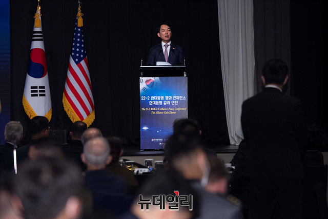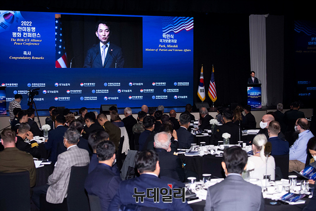 박민식 국가보훈처장이 25일 오후 서울 용산구 그랜드하얏트 호텔에서 열린 2022한미동맹 국제학술회의에서 축사를 하고 있다.