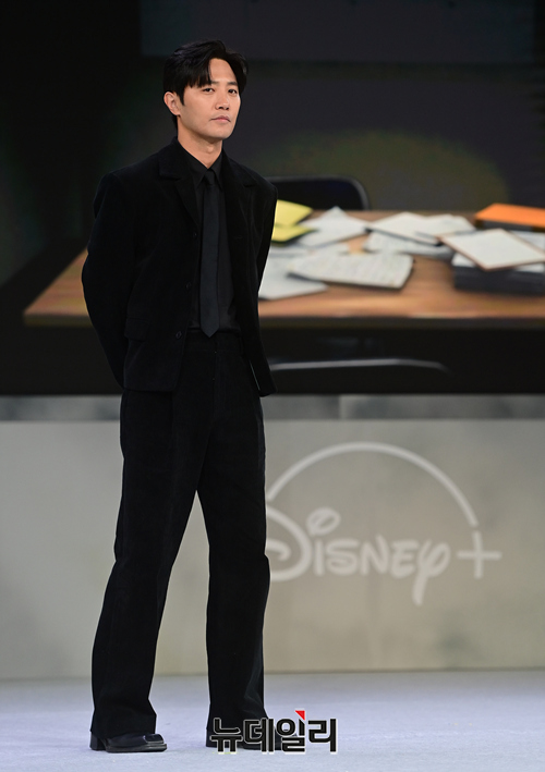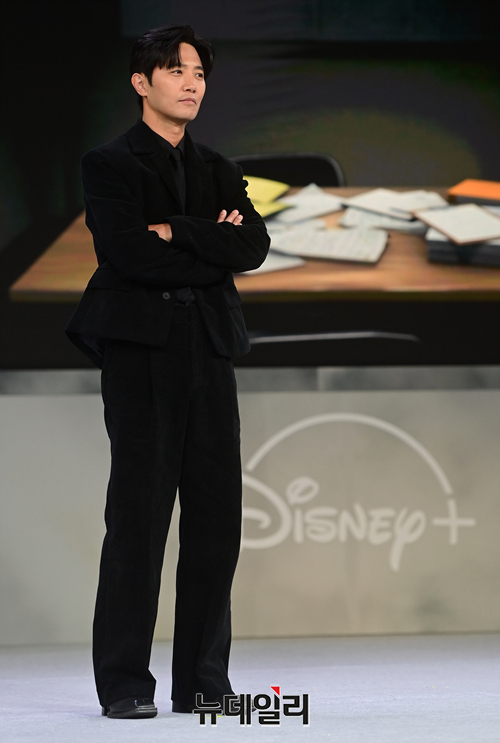 배우 진구가 25일 오전 서울 강남구 그랜드 인터컨티넨탈 서울 파르나스에서 열린 디즈니+ 오리지널 시리즈 '형사록(감독 한동화)' 제작발표회에서 입장하고 있다.