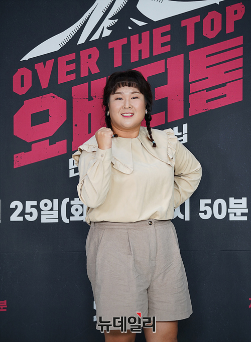 개그우먼 김민경이 25일 오전 온라인으로 열린 JTBC 신규 예능 '오버 더 톱(연출 박성환)' 제작발표회에서 포즈를 취하고 있다.