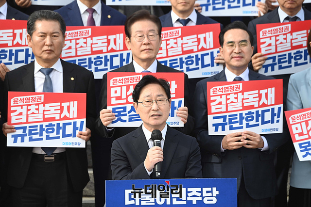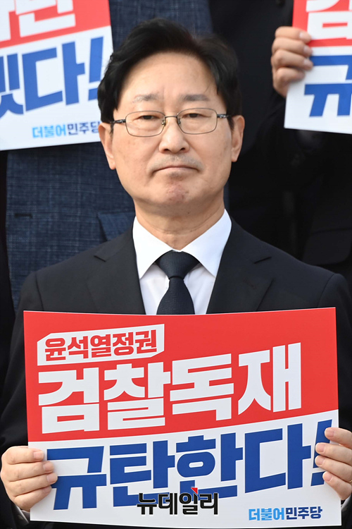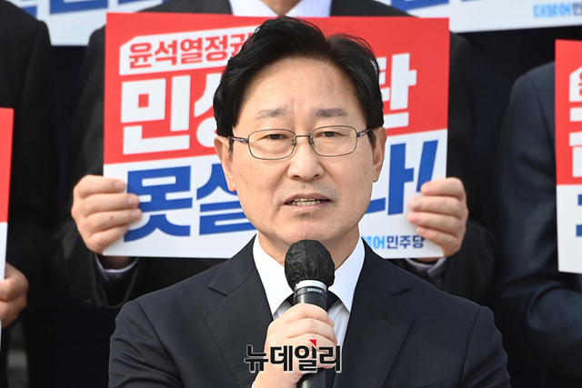 박범계 더불어민주당 윤석열 정권 정치탄압대책위원회 위원장이 26일 오후 국회에서 열린 윤 정권에 대한 민생파탄·검찰독재 규탄대회에서 발언을 하고 있다.