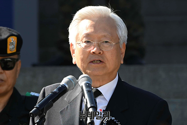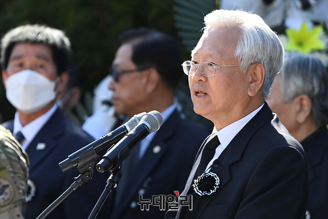 고영주 대한민국사랑회 이사가 26일 오전 서울 동작구 국립서울현충원에서 열린 박정희 대통령 43주기 추도식에서 추도사를 하고 있다.
