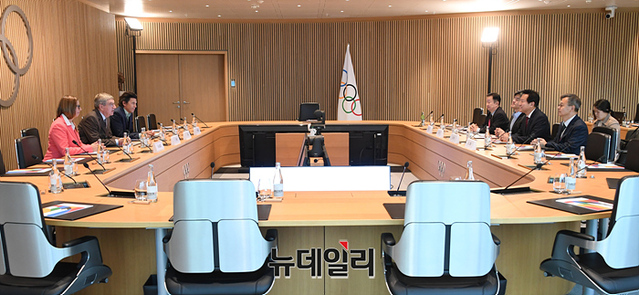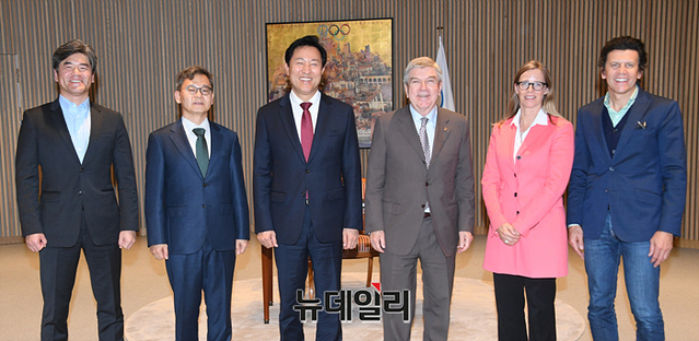 스위스 로잔을 방문 중인 오세훈 서울시장이 24일 오후(현지시간) 올림픽하우스에서 토마스 바흐 IOC위원장과 면담 후 악수하고 있다. (사진=서울시)