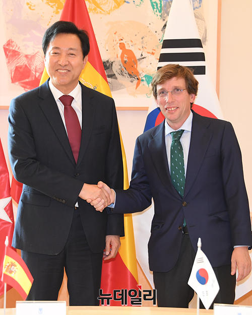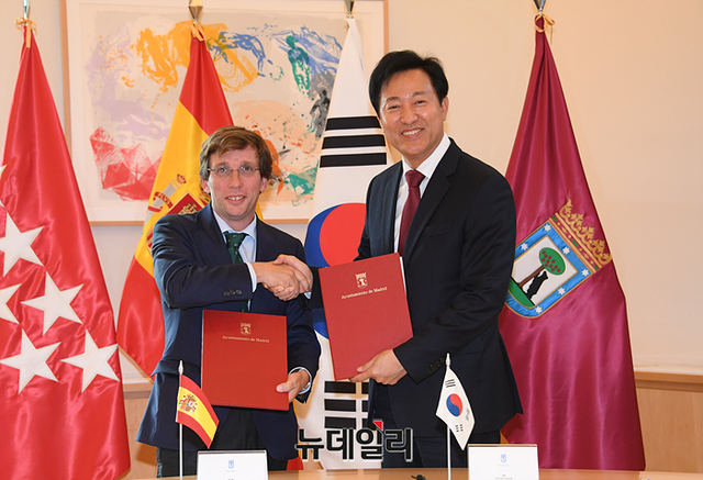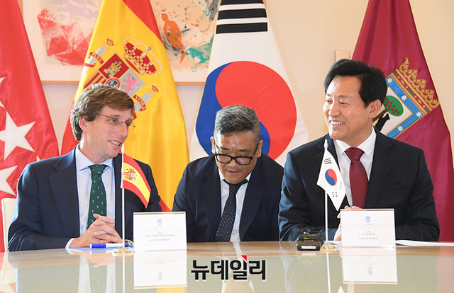 유럽을 방문중인 오세훈 서울시장과 '호세 루이스 마르티네스 알메이다' 마드리드 시장이 26일 오후(현지시간) 마드리드 시청에서 열린 우호도시 협약식에서 기념촬영을 하고 있다. (사진=서울시)
