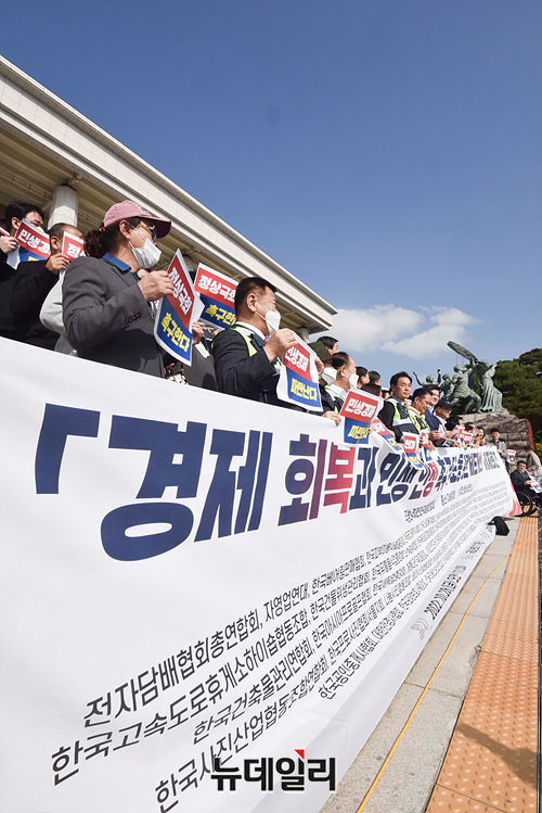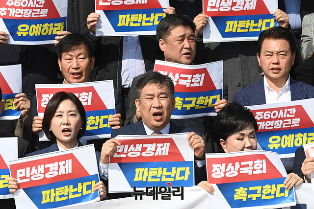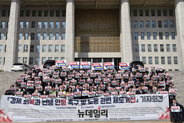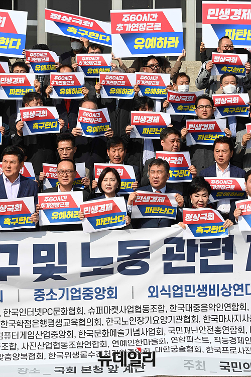 국민의힘 소상공인위원회가 28일 오전 국회에서 열린 경제회복과 민생안정 촉구 및 노동관련 제도개선 기자회견에서 손팻말을 들며 주60시간 추가연장근로 유예 등 구호를 외치고 있다.