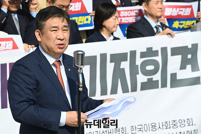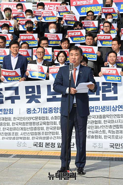 최승재 국민의힘 의원이 28일 오전 국회에서 열린 경제회복과 민생안정 촉구 및 노동관련 제도개선 기자회견에서 발언을 하고 있다.