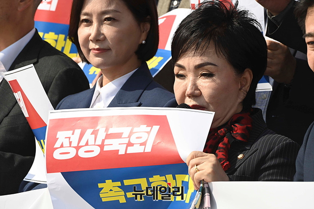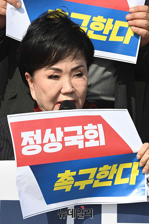 최영희 국민의힘 의원이 28일 오전 국회에서 열린 경제회복과 민생안정 촉구 및 노동관련 제도개선 기자회견에서 발언을 하고 있다.
