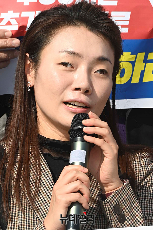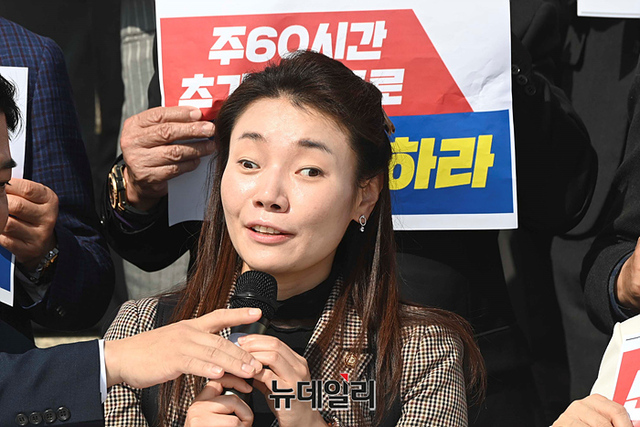 김예지 국민의힘 의원이 28일 오전 국회에서 열린 경제회복과 민생안정 촉구 및 노동관련 제도개선 기자회견에서 발언을 하고 있다.